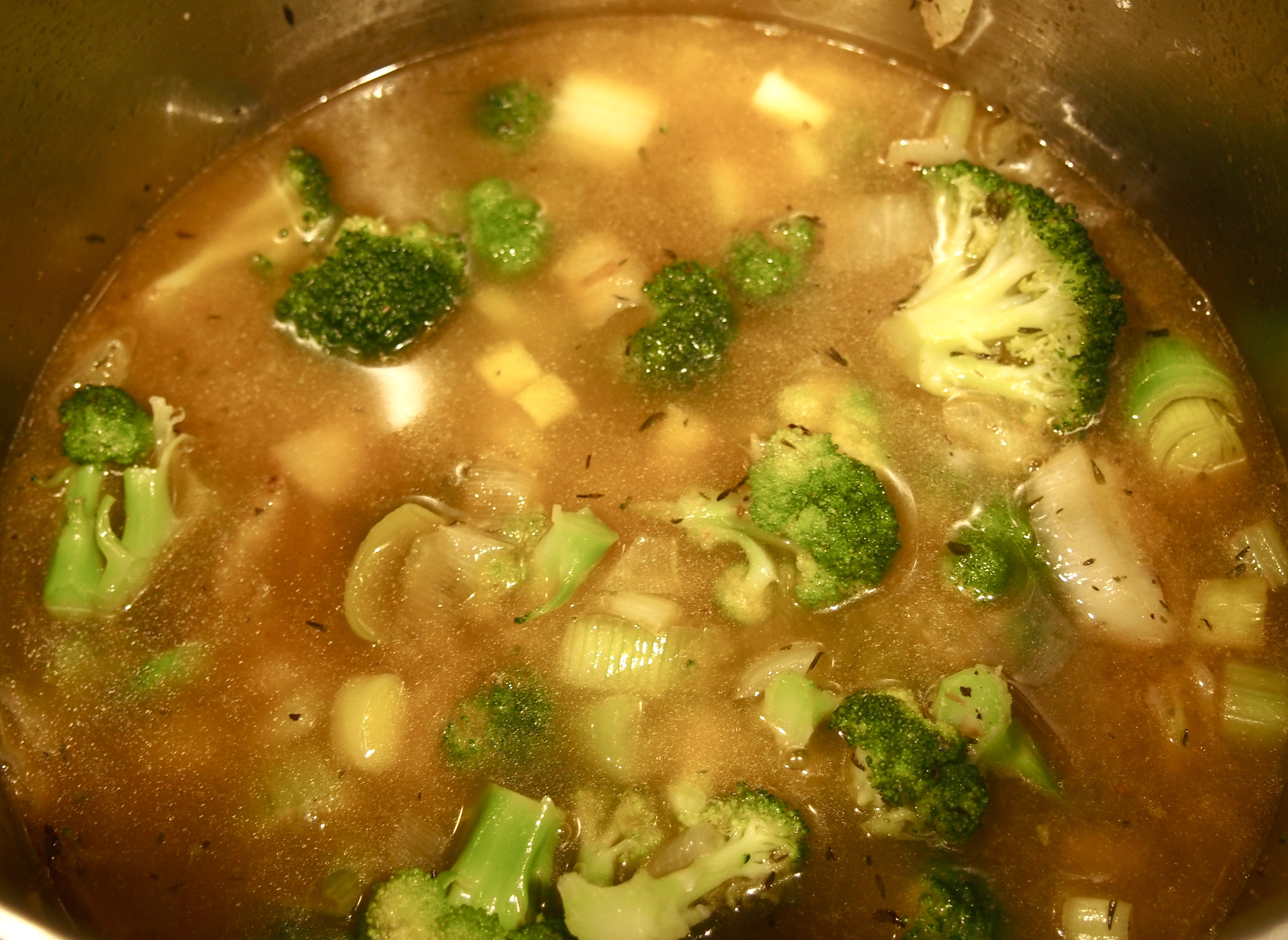 - Chop all of your vegetables. Heat the oil in a large pot over medium heat, then add the onion, leeks, broccoli, celery, garlic, and thyme.